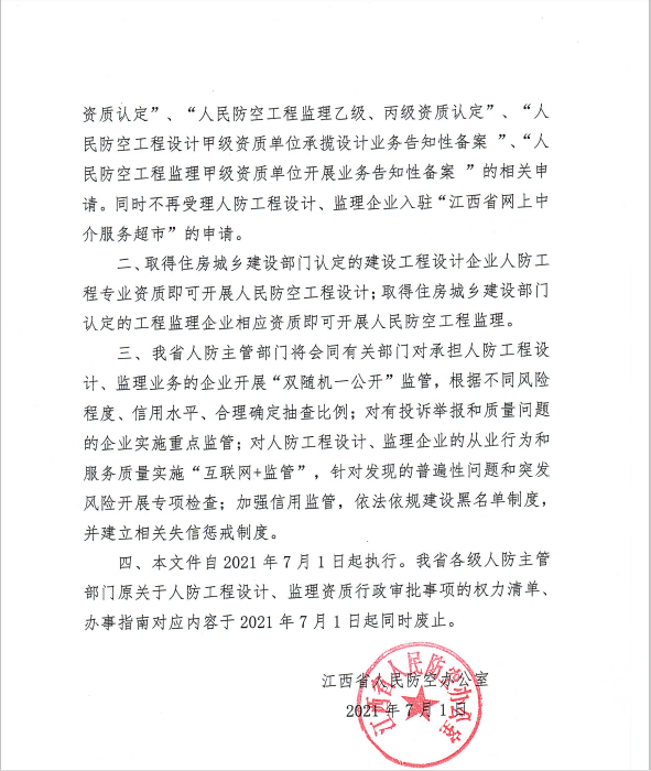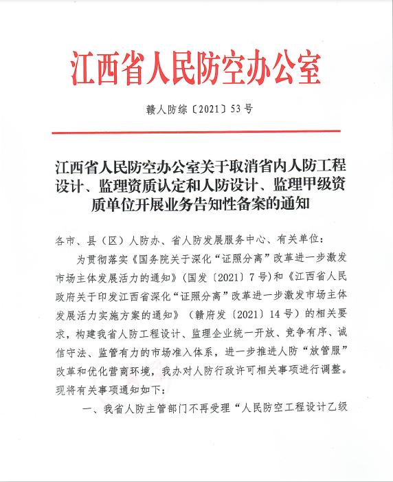 关于取消省内人防工程设计、监理资质认定和人防设计、监理甲级资质单位开展业务告知性备案的通知