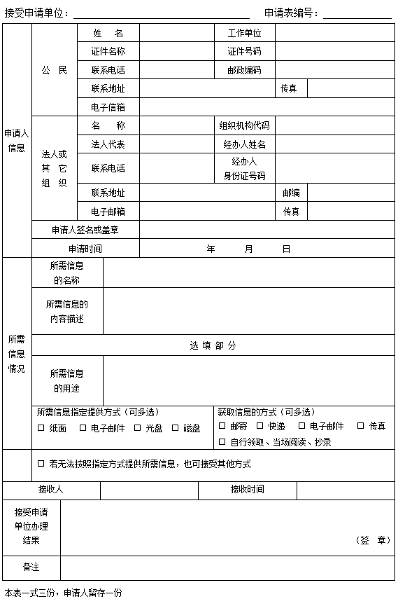 向市国动办提出申请的,填写《景德镇市国防动员办公室信息公开申请表》(样表附后,以下简称《申请表》)。申请表复制有效,可以在市国动办秘书科领取,也可以在景德镇市国动动员办公室门户网站下载电子版。为了提高处理申请的效率,申请人对所需信息的描述请尽量详细、明确;若有可能,请提供该信息的标题、发布时间、文号或者其他有助于本机关确定信息载体的提示。