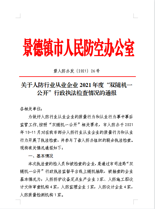 关于人防行业从业企业2021年度“双随机一公开”行政执法检查情况的通报