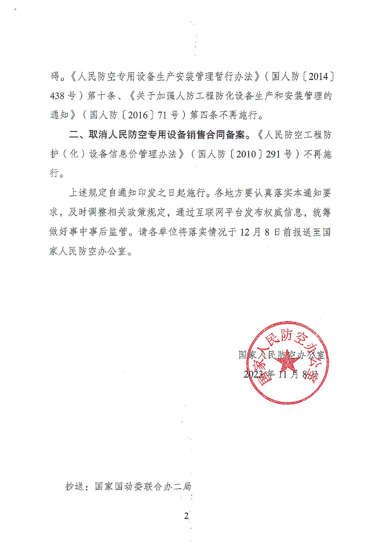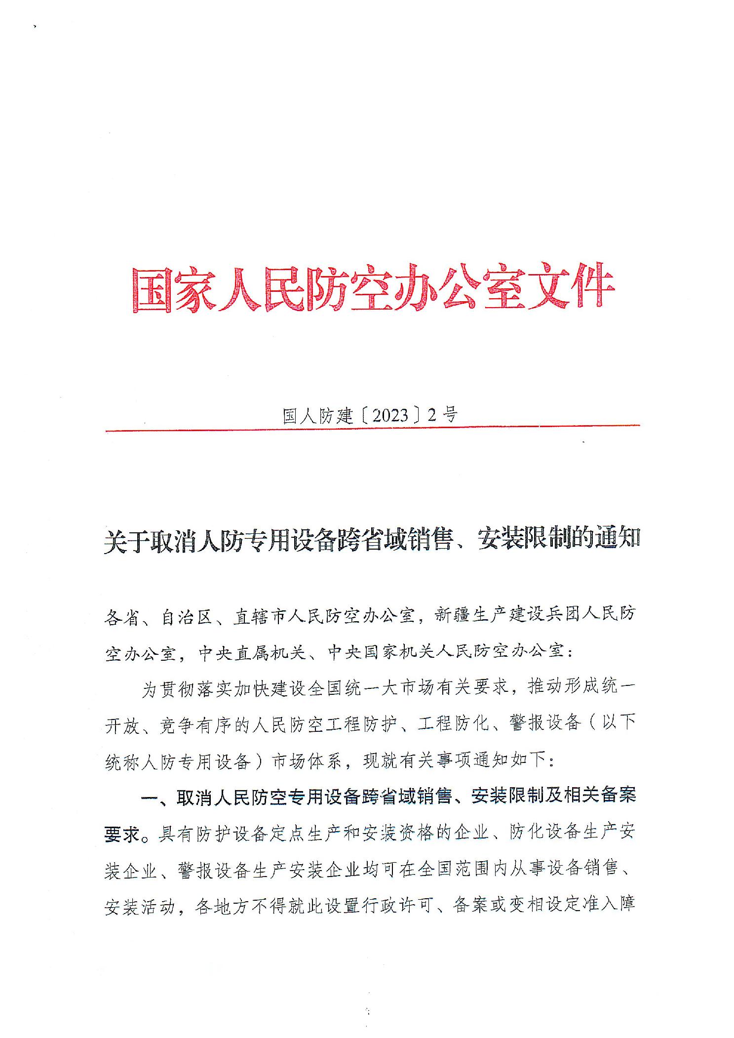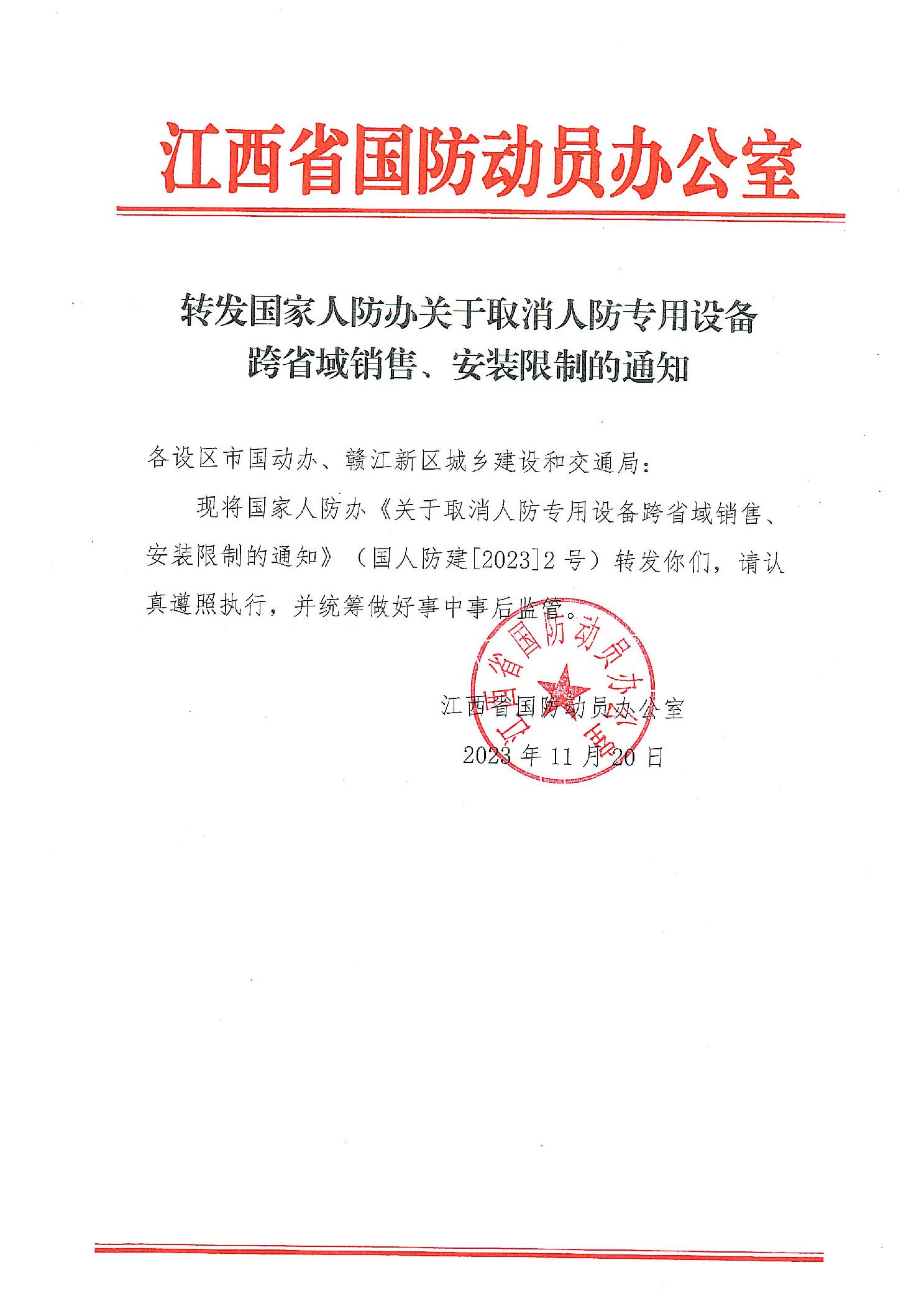 转发国家人防办关于取消人防专用设备跨省域销售、安装限制的通知