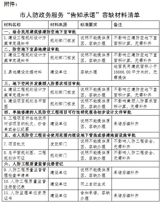 为进一步优化营商环境,制定措施如下:一是提升政务服务质量。常态设立“绿色通道”,坚持开展“代办”服务、“引导”服务,对于涉及重大民生工程、国家陶瓷实验区建设等重大项目,指定专人开展代办引导服务,帮助服务对象,实现“最多跑一次”“一次不跑”。二是全面探索推进“告知承诺”容缺办理。对涉及的人防政务服务事项进行最大程度实行“告知承诺”容缺办理,坚持不影响人防实质性行政审批原则(能计算应建防空地下室面积),全面梳理了15项人防政务服务事项,规范了15类16项具体“告知承诺”事项,在原有基础上再压减11项,极大地压减申报材料清单(详见附件)。